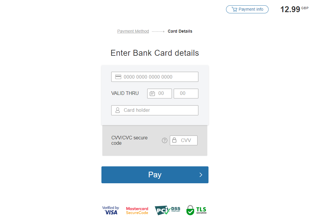 Because payment link purchases are processed via Payment Page, payment requests either do not contain payment instrument data, or provide it in the form of a card token. In the latter case, the customer is required only to prove the validity of the payment instrument; there is no need to specify payment instrument details in the payment form.