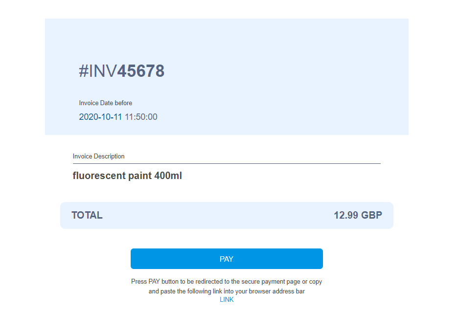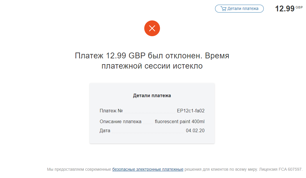 Допустим, пользователь веб-сервиса оформил заказ на сумму 12,99 GBP и выбрал возможность оплаты по платёжной ссылке, указав для получения ссылки свой адрес электронной почты — baskerville@mail.uk.