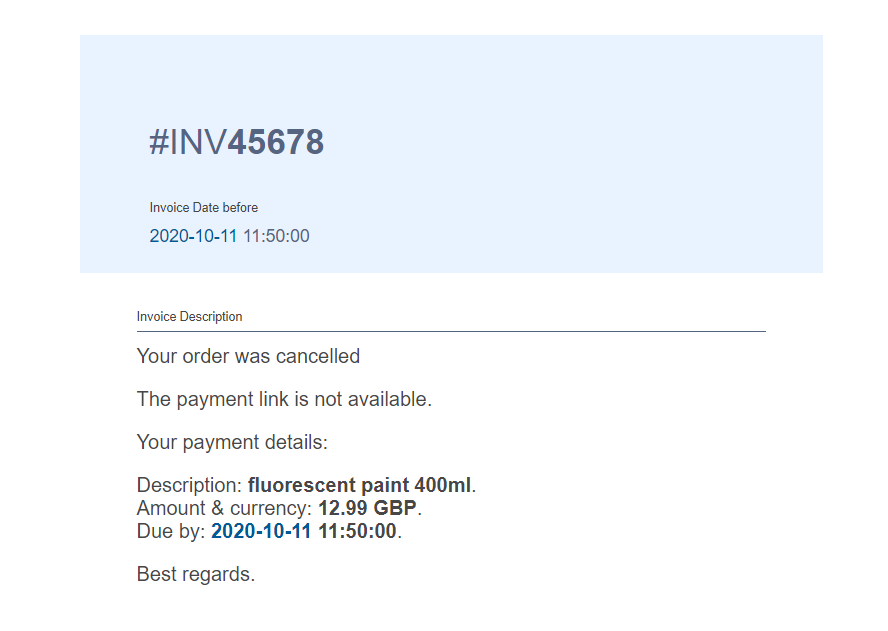 В следующем примере содержится информация о том, что пользователю stapleton на адрес электронной почты baskerville@mail.uk отправлена платёжная ссылка для оплаты заказа в размере 12,99 GBP. Срок действия ссылки истекает 11 октября 2026 года, в 11:50.