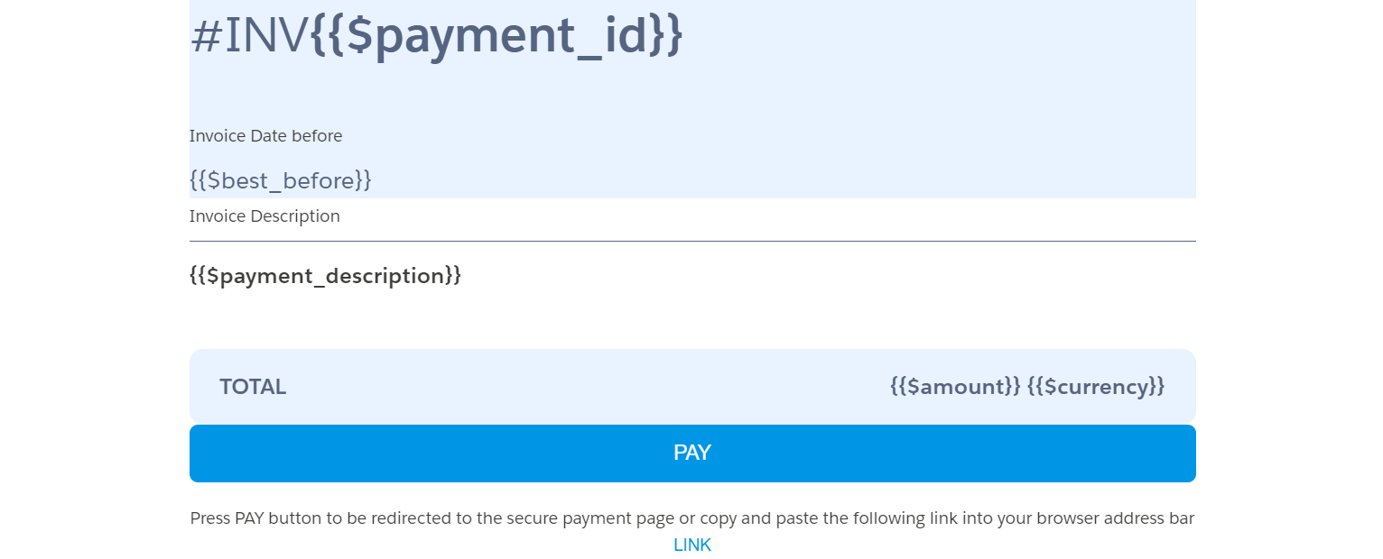 send_email— указатель необходимости автоматической отправки платёжной ссылки (должен принимать значениеtrue);email(в объектеcustomer) — целевой адрес электронной почты пользователя для отправки платёжной ссылки;language(в объектеcustomer) — код языка для оформления письма (его следует указывать, если предпочитаемый для пользователя язык отличается от используемого по умолчанию английского и для этого языка предварительно был настроен шаблон письма).