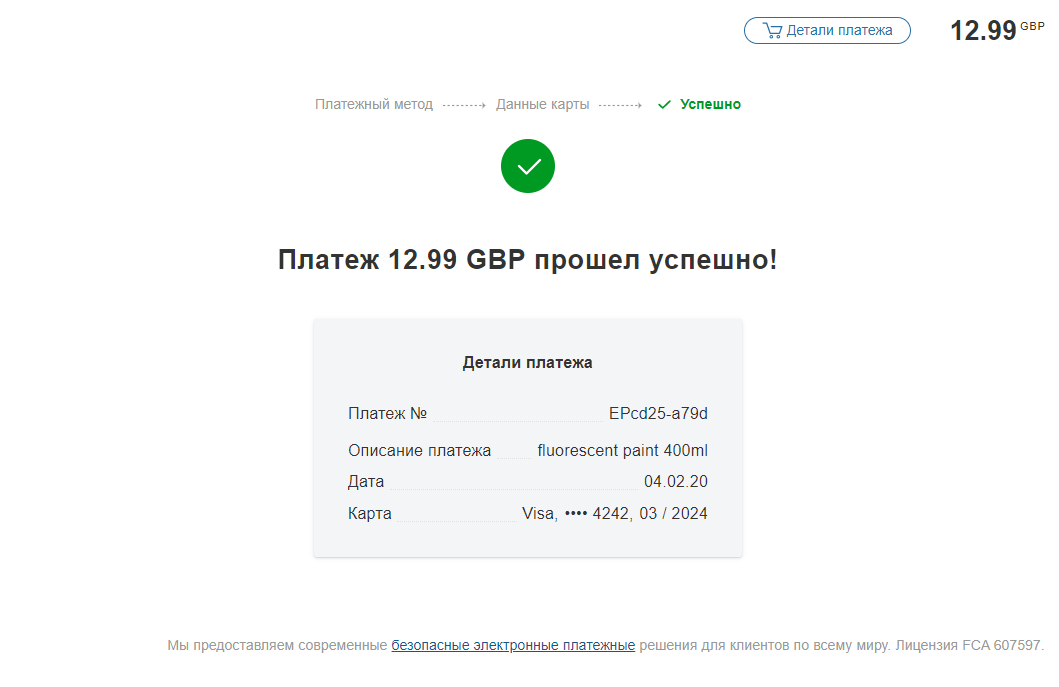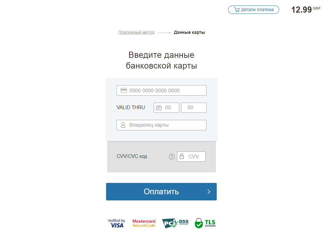 - Пользователь указывает платёжные данные и подтверждает оплату.