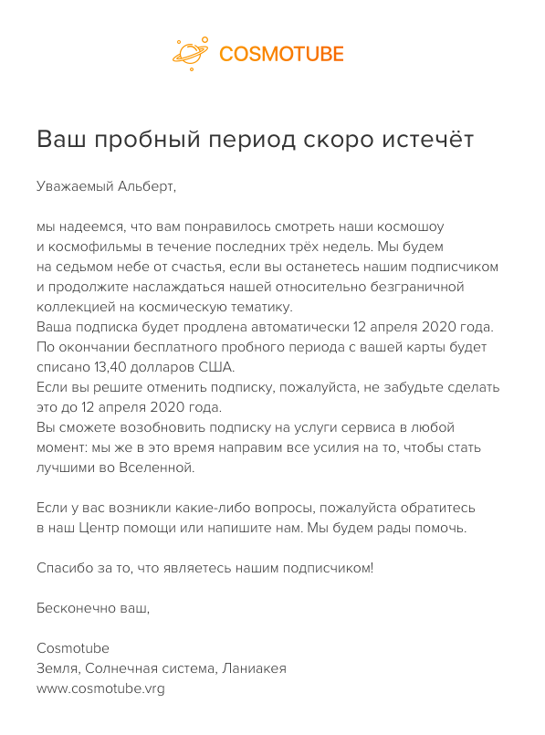 - Уведомление с информацией об окончании бесплатного пробного периода, которое не содержит поля, включаемые в стандартный шаблон (за исключением логотипа мерчанта).