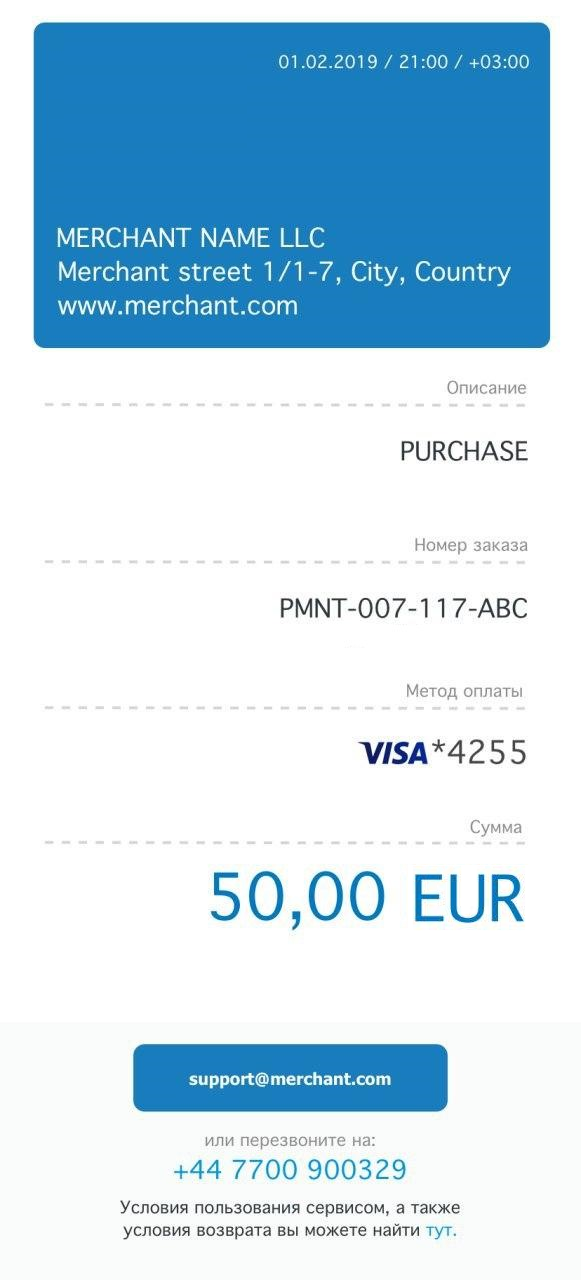 - возможность отправлять скрытые копии уведомлений на адрес электронной почты, предоставленный мерчантом.