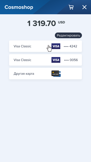 - Отображение сохранённых данных определённой платёжной системы. Для оплаты с прямым использованием карт можно ограничивать выбор карт, данные которых были сохранены пользователем. В таком случае в запросе на открытие Payment Page указывается идентификатор предпочтительной платёжной системы (например, Mastercard или Visa), в результате чего первой пользователю отображается страница выбора платёжной карты с данными карт указанной платёжной системы. Если таких данных нет или среди представленных карт нет подходящих, то пользователь может указать данные другой карты, в том числе другой платёжной системы.