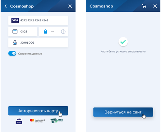 - Аутентификация 3‑D Secure, при выполнении которой происходит перенаправление пользователя к сервису эмитента, где необходимо подтвердить свою подлинность кодом из SMS-сообщения или иным способом, либо отображается страница ожидания (в то время, пока эмитент подтверждает подлинность без участия пользователя).