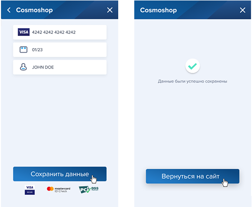 mode— индикатор режима работы Payment Page, для которого необходимо передавать значениеcard_tokenize.project_id— идентификатор проекта, полученный от EtoPlatezhi при интеграции;customer_id— идентификатор пользователя в веб-сервисе мерчанта;signature— подпись запроса, составленная после указания целевых параметров (подробнее — в разделе Работа с подписью к данным).